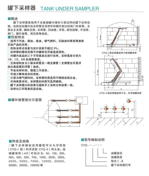 罐下采样器是指用于采集储罐内储存介质试样的罐下采样设施。包括设在罐内的采样管及其附件和罐外部分的阀门和泵等。据鹤管厂家讲解罐下采样器主要由主支撑、辅助支撑、采样管、回油管、浮筒、柔性接管、手动泵、阀门、罐外接管、固定架等组成。