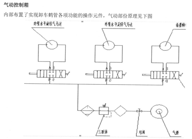 (1)气缸控制系统能在鹤管工作的时候提供动力,操控鹤管外臂上仰或者下俯以及压紧密封帽,动作灵活性比较好,减轻工作人员劳动强度。要求现场气源压力保证(大于0.4Mpa)
