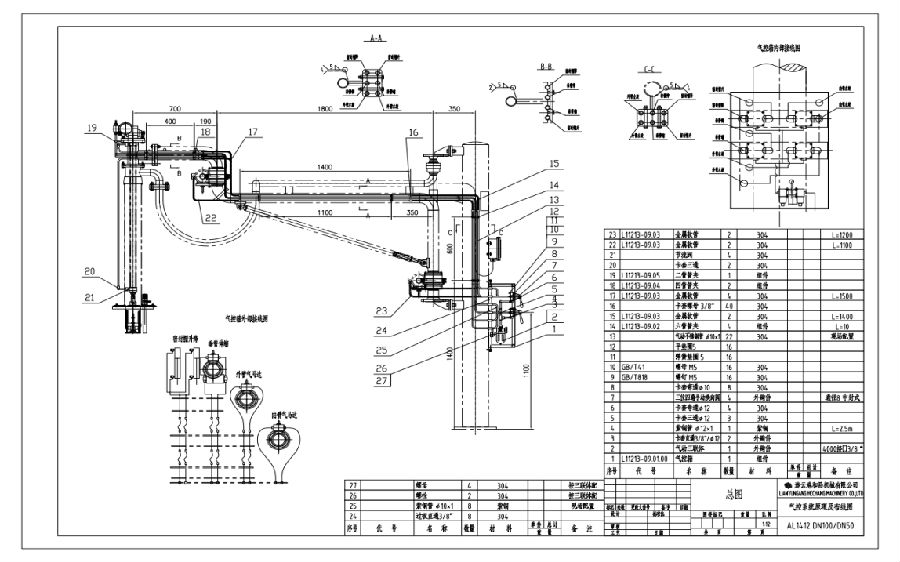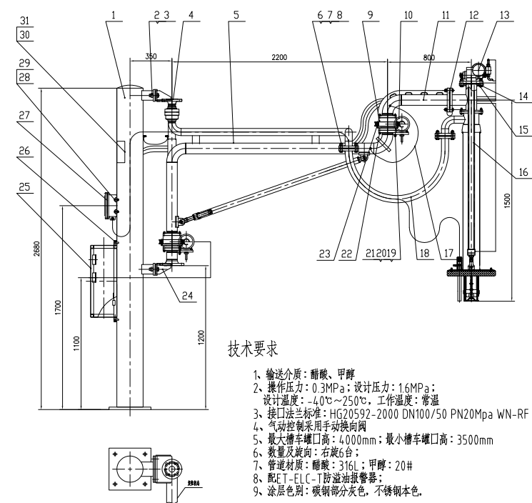 (2)气动马达控制的全自动鹤管,内臂、外臂的水平转动由气动马达通过涡轮蜗杆的转动实现。鹤管的垂管的升降由气动马达及钢丝绳共同实现。要求现场气源压力保证(大于0.4Mpa)